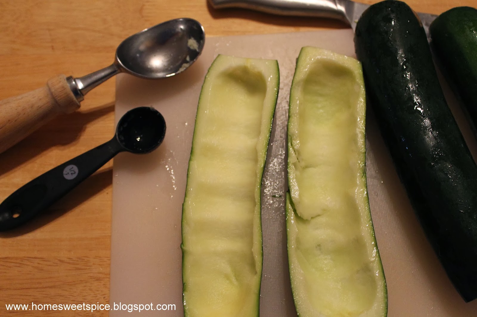 - Scoop out the center of the zucchini halves. As much as you can. I used an ice cream scooper, but it was spiteful and broke the zucchini. So I switched to a 1/2 tsp. measuring spoon.